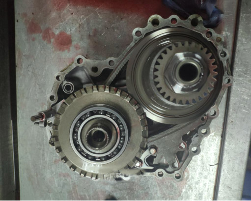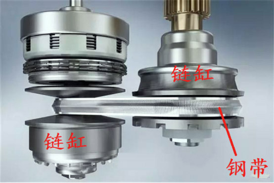 这是CVT变速箱传动机构:钢带容易磨,一旦仪表跳出发动机故障灯,突然跑不起来了,赶紧找专业的地方用电脑检测,报次级减压,压力过低等故障码,一般是钢带夹紧力不够,一定要记住这个时候千万不要开车,一开就会拉缸!