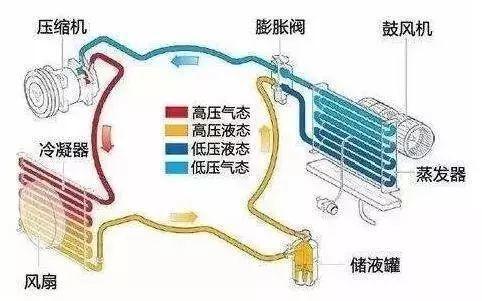 上图显示了整个空调的工作过程。在整个过程中,冷凝器的作用不言而喻。冷凝器是排出压缩机的高压过热制冷剂蒸汽,释放热量后凝结成液体。它通常位于水箱前面和车头中间网后面。这使得附着各种灰尘和杂物变得容易,尤其是在北方季节,当柳絮飞舞时,它们会聚集在水箱和冷凝器之间。而一旦附着在太多的东西上,就会导致冷凝器的制冷效果下降,这也是我们的空调在夏天制冷效果不好的原因。